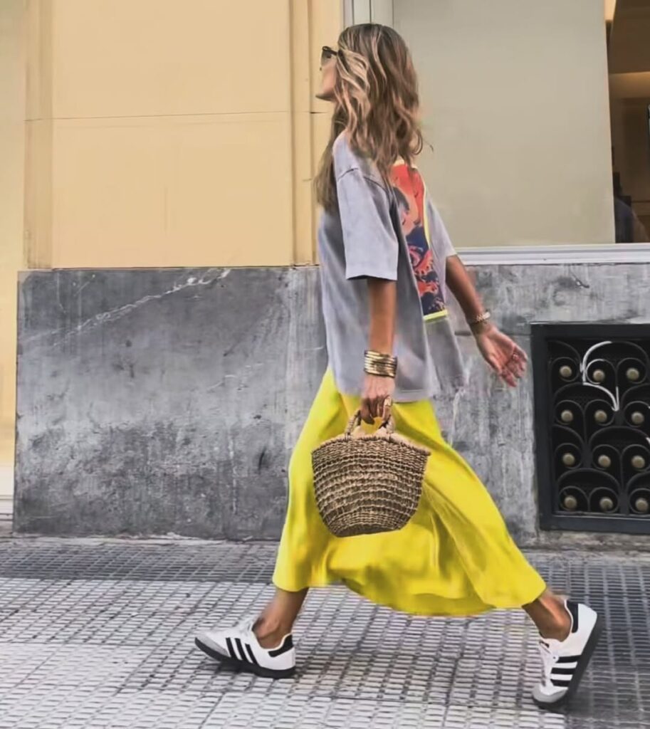 This outfit is an explosion of color and effortless energy. A vivid yellow midi skirt adds major personality, while the oversized graphic tee brings cool-girl balance. Paired with classic black-and-white Adidas Sambas and a woven straw bag, the look screams vacation or weekend city wanderer. The arm bangles and tousled waves give it a touch of boho flair.