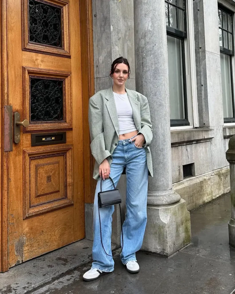 This relaxed look nails the model-off-duty aesthetic. A cropped gray sweatshirt shows off the midriff, paired effortlessly with slouchy, vintage-wash baggy jeans. The Adidas Sambas in white and green add that street-cool contrast while keeping things grounded and comfy.