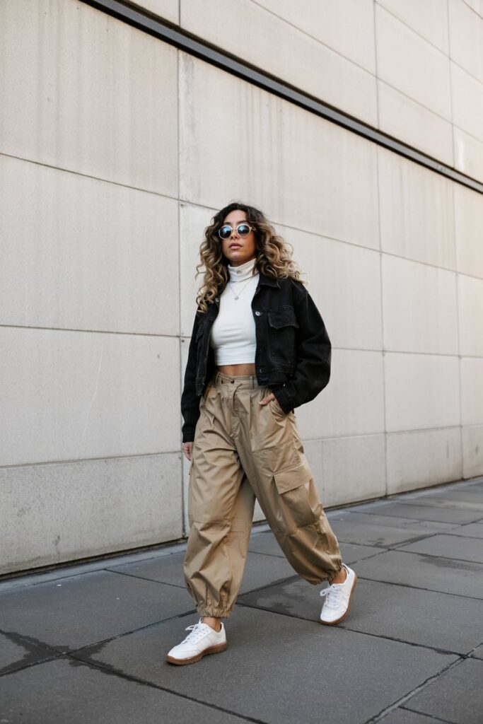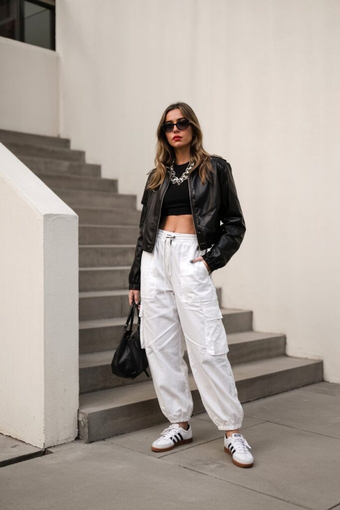 Balance white cargo pants with a sleek black crop top. Add a statement necklace, a bold lip, and your Sambas. It’s clean, modern, and Pinterest-board perfect.