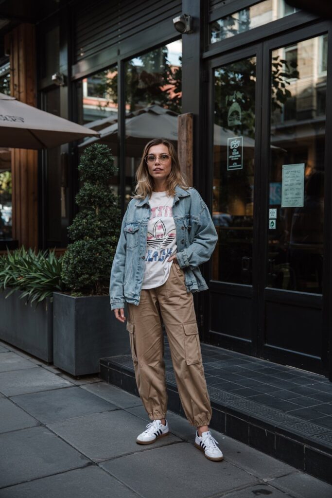 Your off-duty formula: a vintage tee, light-wash denim jacket, and tan cargo pants. Add Sambas for that subtle throwback vibe. This look’s ideal for coffee runs or gallery strolls on lazy Saturdays.