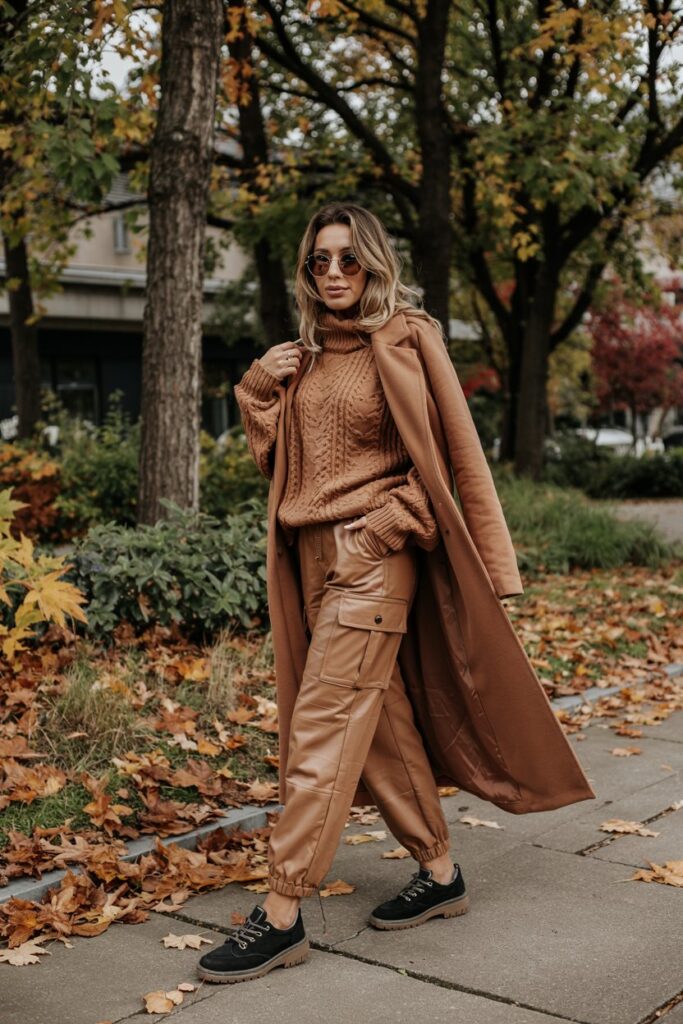 Slip into soft cargo pants and a chunky knit sweater (think caramel or burgundy tones). Layer with a long overcoat and black Sambas. It’s cozy, it’s classy, and the pockets? Totally functional for your PSL and lip gloss.