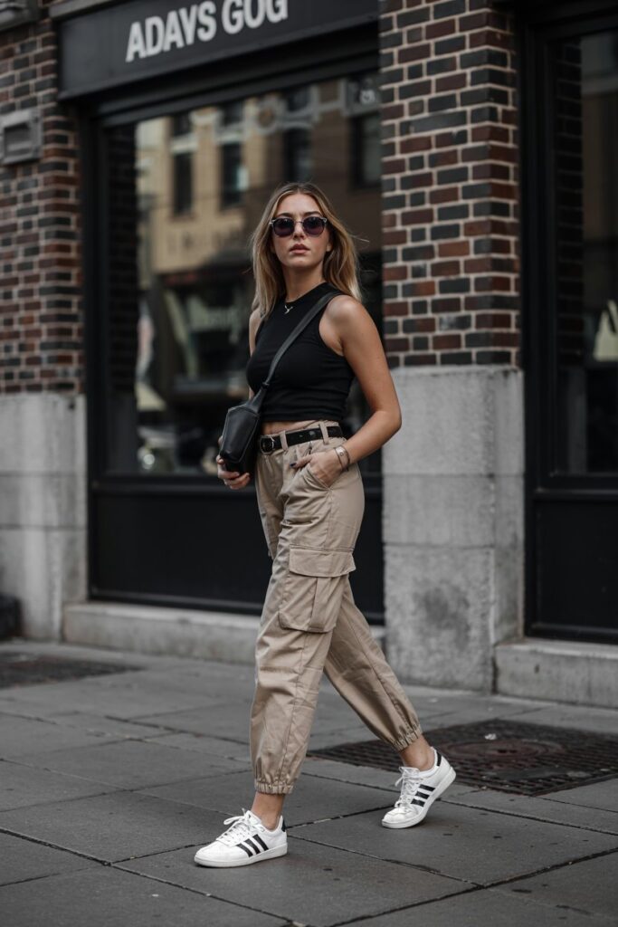 Light cotton or linen cargo pants in sand or sage green, a ribbed tank top, and Sambas—summer style done right. Keep accessories light: woven bags, shell jewelry, and dewy makeup complement the look perfectly.