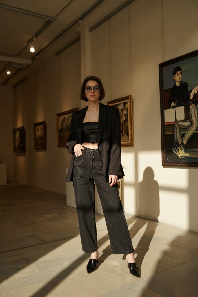 - Contrast the Curve: Pair the jeans’ volume with sleek shoes like mules or slip-ons for balance, or go bold with chunky boots to match their drama.