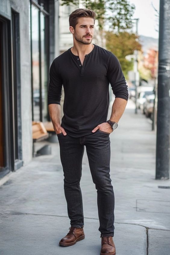 A simple all-black base instantly sharpens the look, letting the brown leather chukkas stand out with effortless contrast. The fitted long-sleeve henley keeps things sleek without trying too hard, while the slim dark jeans create a clean line from top to bottom. The outfit feels modern, masculine, and easy to replicate—perfect for casual city days or dressed-down evenings.