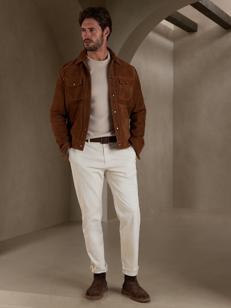 This outfit nails the earthy-tone aesthetic with a mix that feels clean, rich, and effortlessly refined. The camel suede jacket adds texture and depth, while the cream sweater underneath keeps everything soft and balanced. Off-white trousers brighten the whole fit, creating a crisp contrast that still stays warm and cohesive. The dark brown suede chukka boots finish it off with a rugged, grounded touch—perfect for fall or early winter.