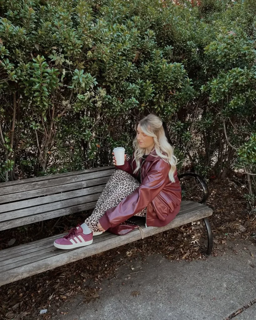 Why It Works: The deep burgundy jacket adds rich fall color, while the leopard pants bring a playful, statement print. Burgundy sneakers tie the whole look together for a coordinated finish.