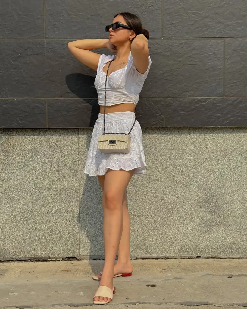 This breezy white co-ord set features a crisp cropped top and flared mini skirt—lightweight, playful, and made for summer. The nude flat slides add a comfy-chic vibe, keeping things minimal yet stylish. A mini quilted crossbody and black sunnies complete the look with a touch of street-smart glam.