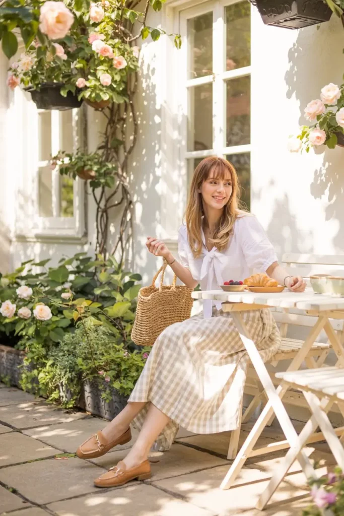 Go sweet with a gingham print skirt and a knotted blouse. Brown or tan loafers give it a polished finish. Add a straw tote and you’re brunch-date ready.