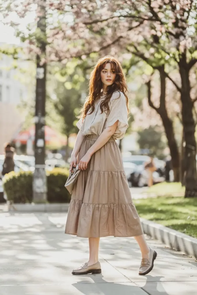Romantic and layered—style a tiered skirt with a soft ruffle blouse and sleek loafers for a feminine outfit that still feels grounded. Great for early fall or spring looks.