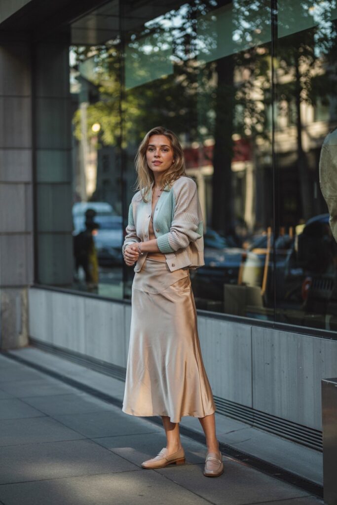 A silky slip skirt pairs beautifully with a fitted cropped cardigan and simple leather loafers. This look balances softness and structure—elevated yet comfortable for gallery visits or weekend brunch.