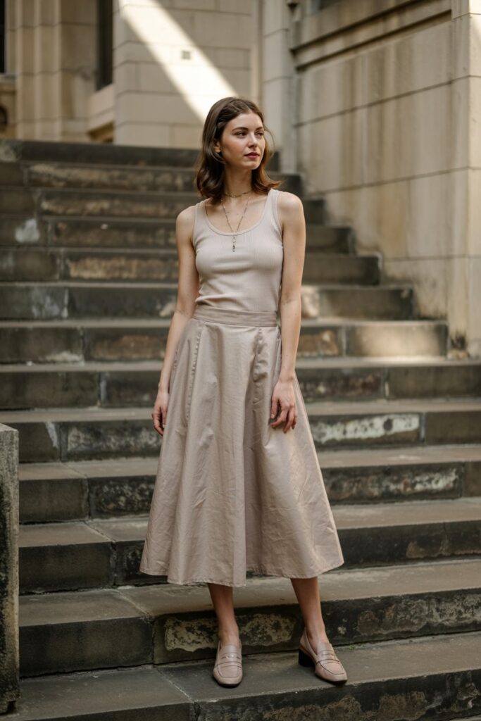 A classic A-line skirt paired with a knit or ribbed tank gives a nod to vintage style. Finish with mid-height loafers and dainty accessories. Ideal for daytime museum strolls or solo café moments.