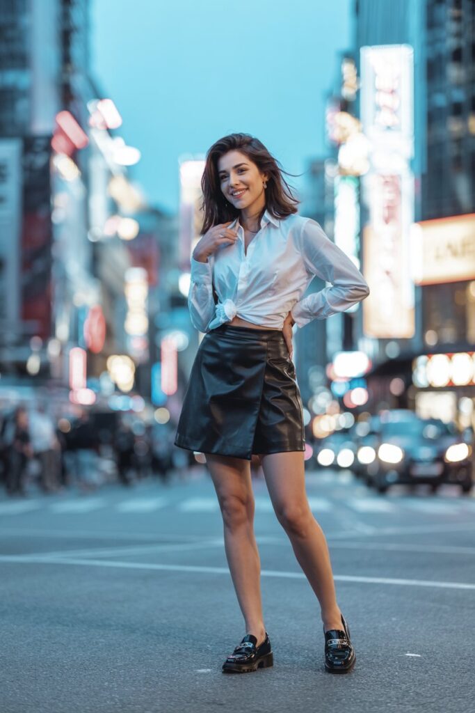 Bring edge to your look with a black leather skirt, white shirt (half-tucked), and black loafers. Add gold earrings and a red lip for a night-out vibe that’s not trying too hard.