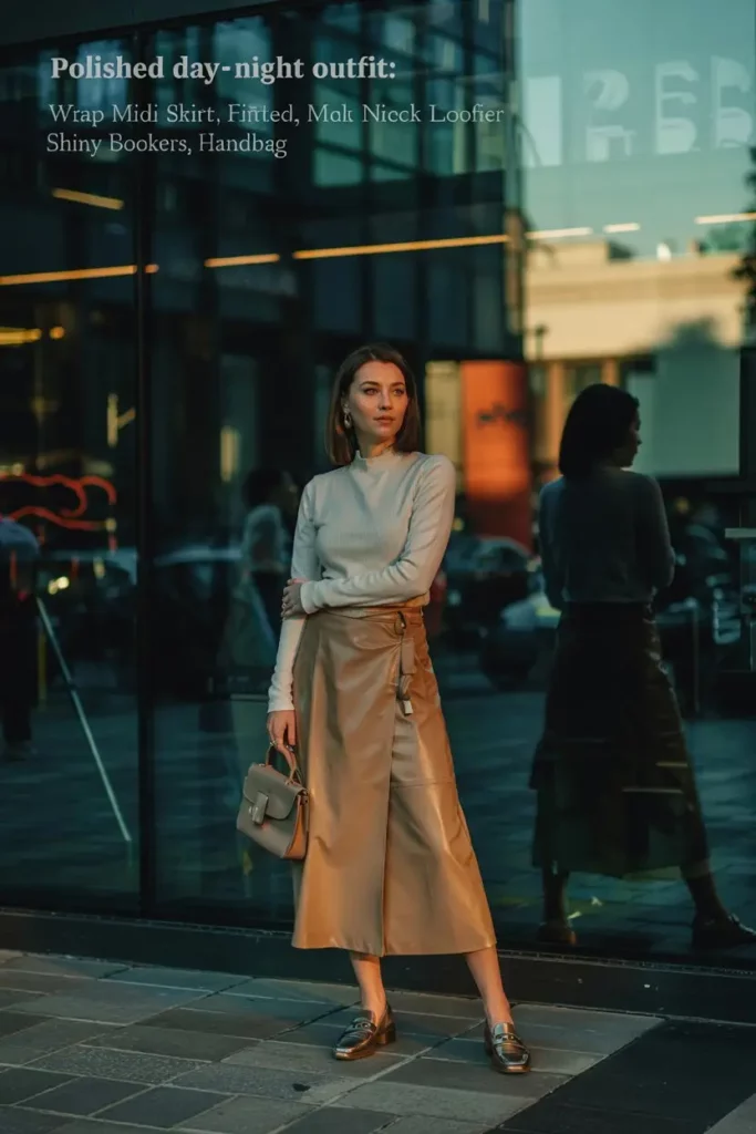 Wrap skirts flatter every figure. Pair yours with a fitted top and glossy loafers. Add subtle jewelry and a tote for an outfit that transitions easily from day to evening.