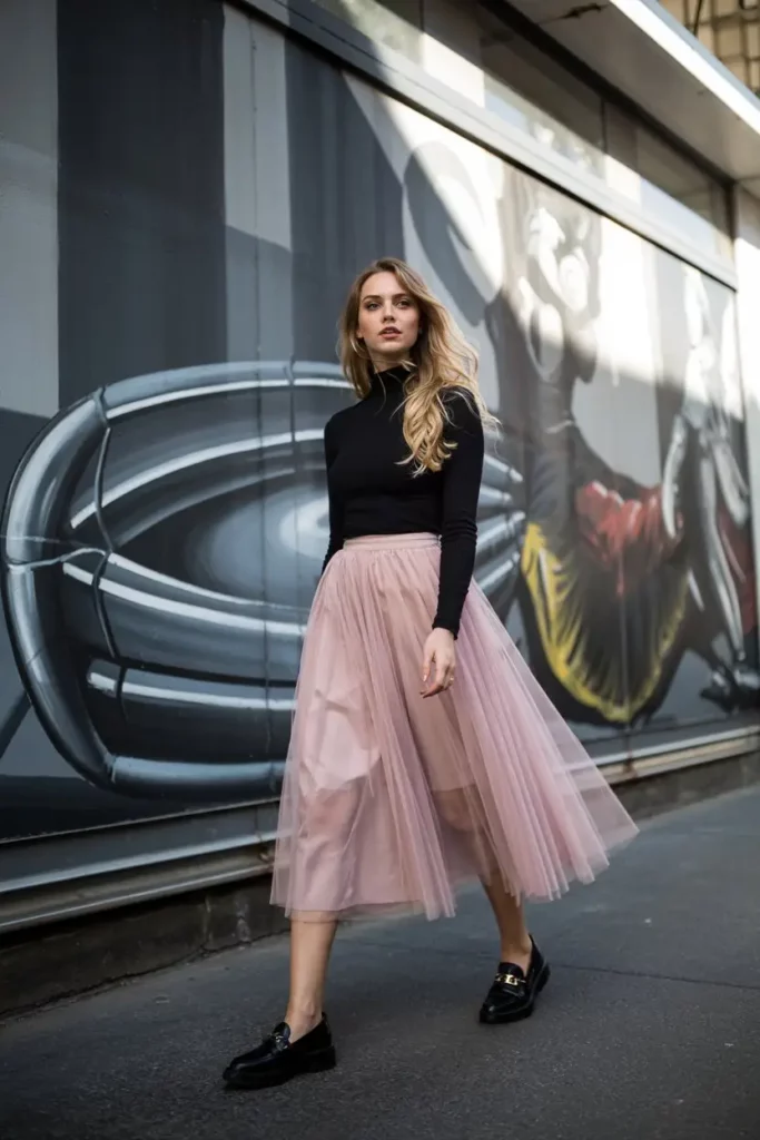 Make tulle wearable by pairing it with a solid turtleneck and sleek loafers. This outfit is all about unexpected contrasts—girly and grounded. Ideal for creative events or fashion-forward dinners.