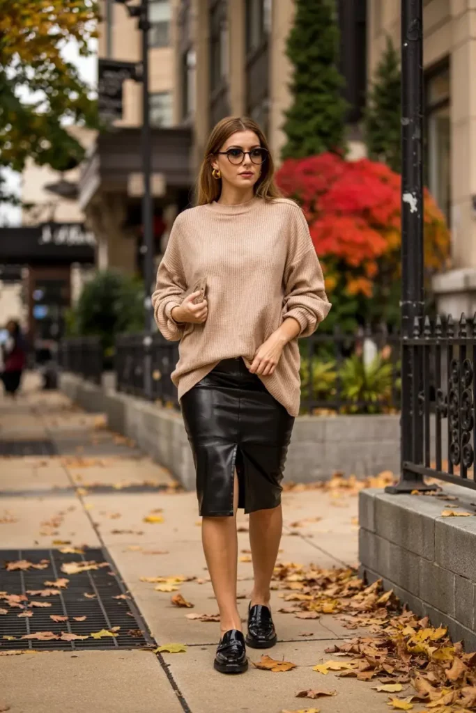 Balance a body-hugging pencil skirt with an oversized sweater tucked slightly in front. Patent loafers add shine. The look is office-friendly but still stylish enough for after-hours plans.