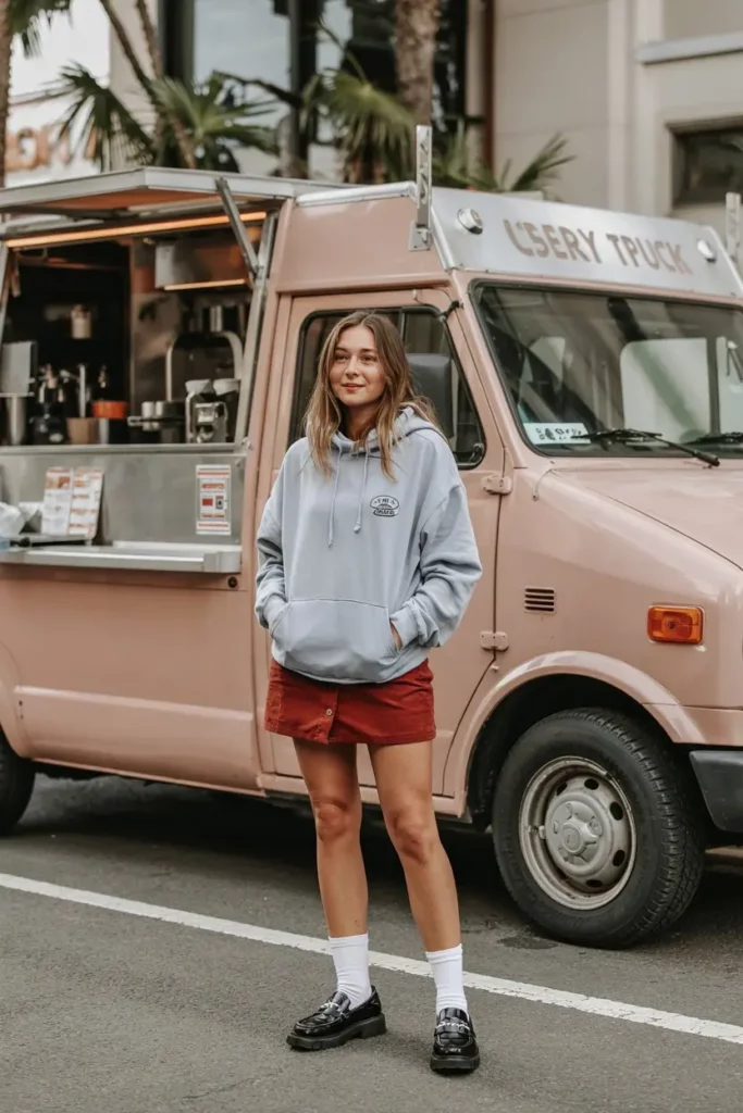 For Gen Z cool, wear a mini corduroy skirt with an oversized hoodie and chunky loafers. Add ankle socks and a crossbody bag for a playful, on-trend finish.