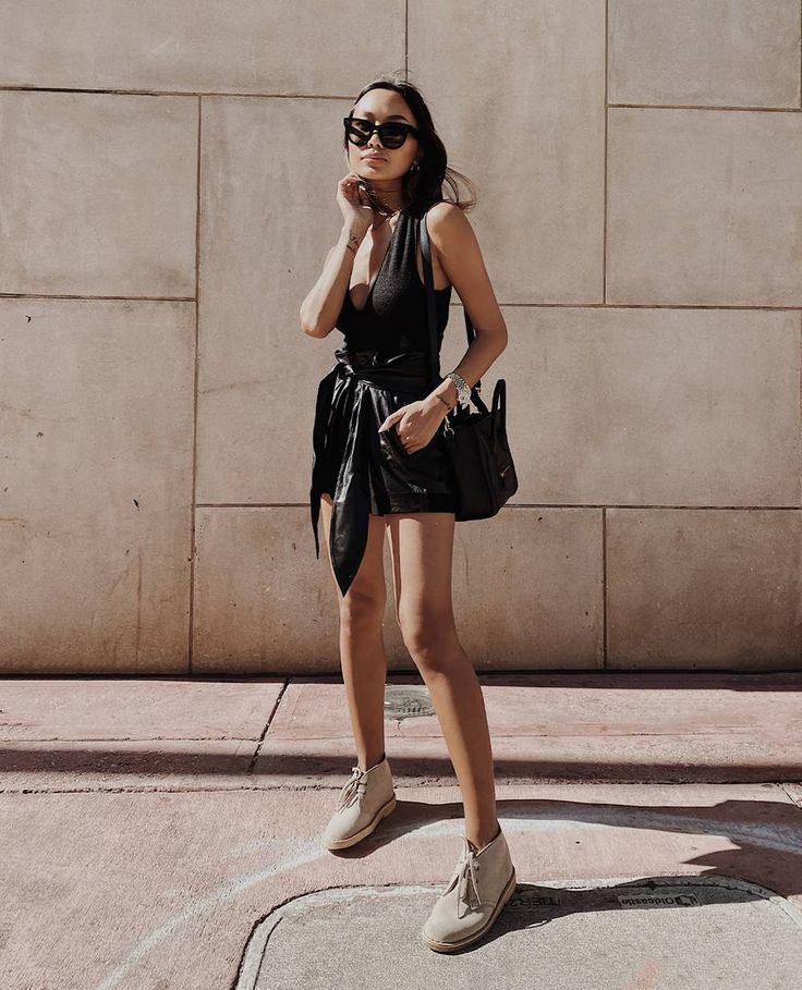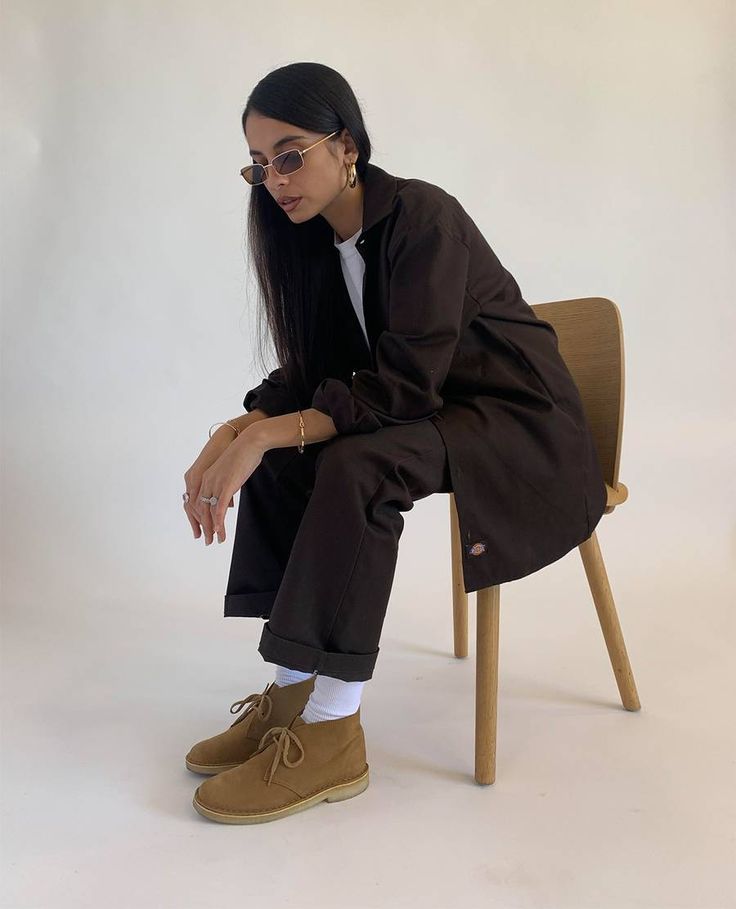 The beige chukka boots break up the monochrome in the best way, adding softness and making the outfit feel lighter and more wearable for daytime. It’s a simple but striking mix of minimal style and modern edge.