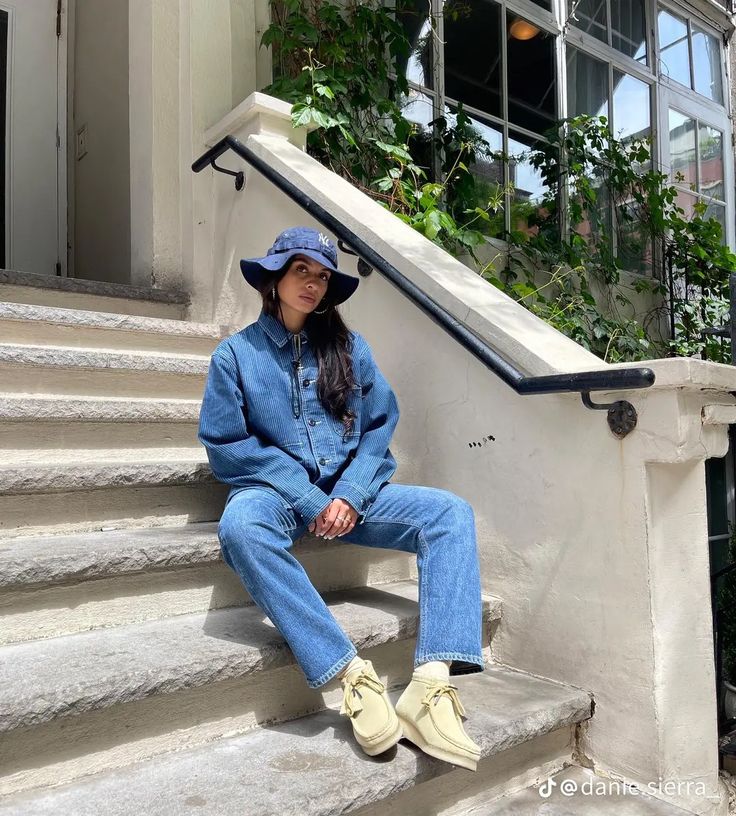 A full denim look feels effortlessly cool here, blending a structured jacket with easy straight-leg jeans. The matching bucket hat adds a playful touch, keeping the outfit casual and laid-back.