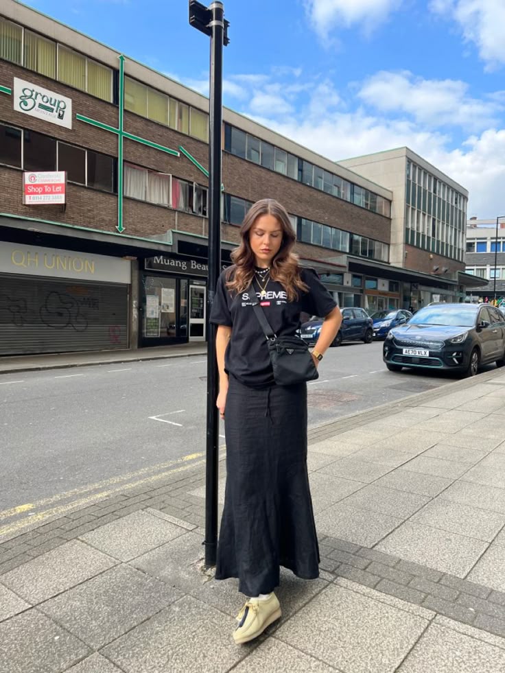 A graphic tee and long black skirt create a clean, modern streetwear look that’s both relaxed and polished. The crossbody bag adds a practical edge while keeping the outfit streamlined.