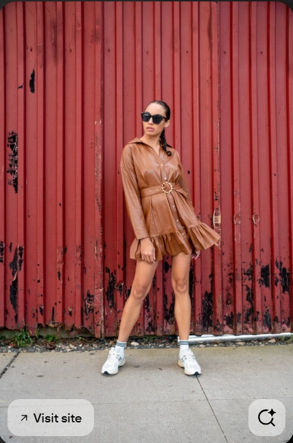 Feminine structure stands out in this New Balance 1906R outfit with its bold yet balanced styling. The brown leather mini dress adds texture and a defined waist, creating a confident and polished silhouette. Soft white socks and New Balance 1906R sneakers bring a sporty contrast that keeps the look relaxed. Minimal sunglasses and simple accessories complete the outfit with modern city style.
